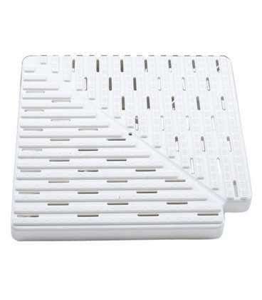 Placas para esquinas de canal rebosadero de 90° construidas en polipropileno copolímero inyectado, color blanco.