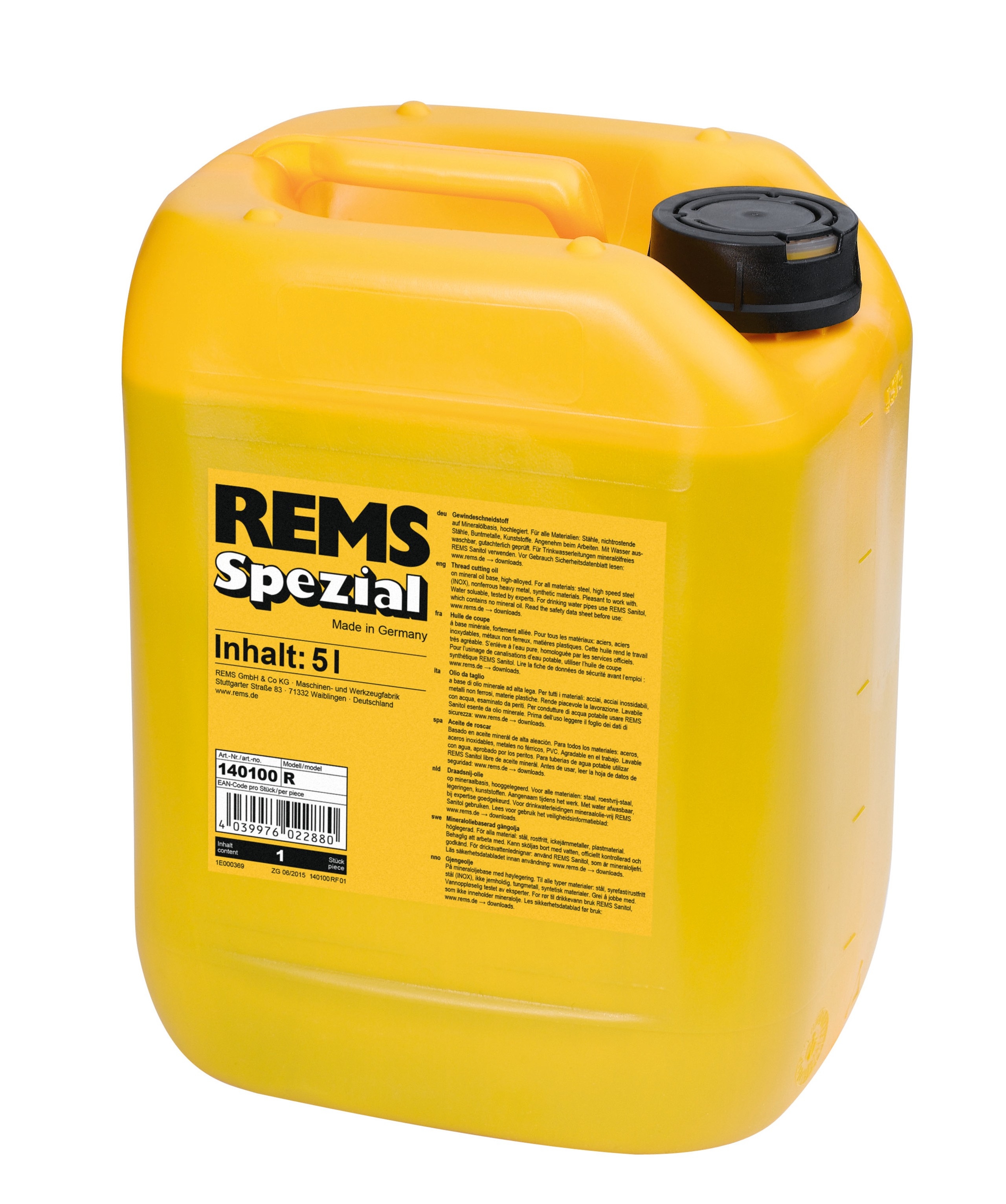 Bidon Aceite 5Lt. 140100 RReferencia de Fabricante: 140100 RCodigo de Barras: 4039976022880Marca: REMS MAQUINAS PARA COBREDimensiones (ancho x largo x alto): 152x188x248Peso (kg): 0