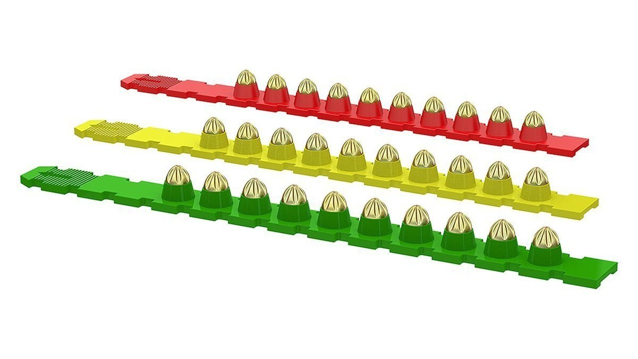 Impulsores para herramientas automáticas y semiautomáticas de impulsión Peines de plástico con 10 impulsores de calibre Ø 6-8 x 11 mm Perfil exterior para adecuado avance de la pistola de uno en uno Impulsores verdes- amarillos- rojos y negros en función de la potencia Aplicaciones Uso en herramientas de clavado con buterola intermedia -émbolo- para tiro indirecto- para clavado de clavos en superficies duras- como el hormigón o los perfiles de acero empleados en la industria de la construcción-