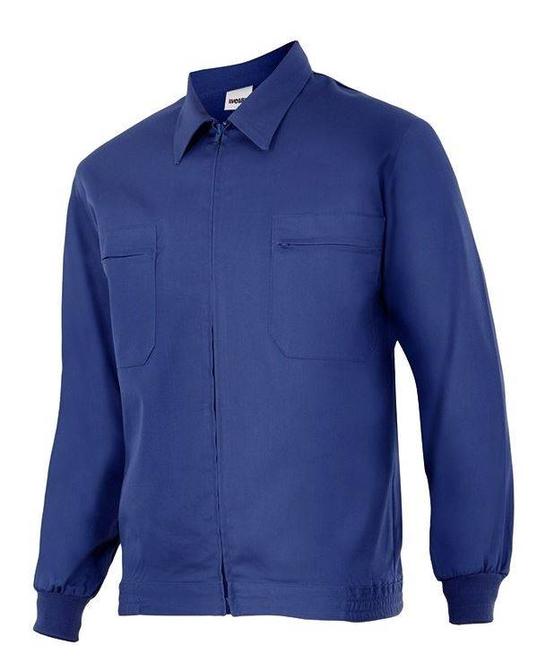 Cazadora laboral con cremallera central. Puños de canalé, dos bolsillos de plaston con cremallera en el pecho y cintura con elástico en los laterales.? Una prenda laboral de buen rendimiento y con varios colores disponibles para las diversas uniformidades. Su alto contenido de poliester en la composicion hace una resistente a los lavados.Composición: 80%poliéster -20% algodón??.Material: Sarga. Gramaje: 190 grs.