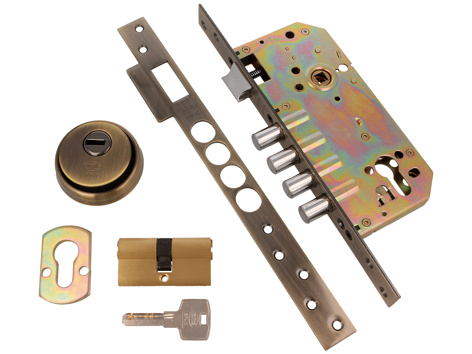 Cerradura de embutir para puertas de madera con bulones de cierre.Canto cuadrado.Frente y soporte.Picaporte reversible.Distancia entre nueca de manilla y alojamiento de cilindro Europerfil: 85 mm.Nueca para manilla de 8 mm.Incluye cilindro de seguridad modelo 9850 de 60 (30-30) mm y escudo de seguridad modelo 31 sin bocallave.Homologada con marcado CE según norma EN 12209:2004.