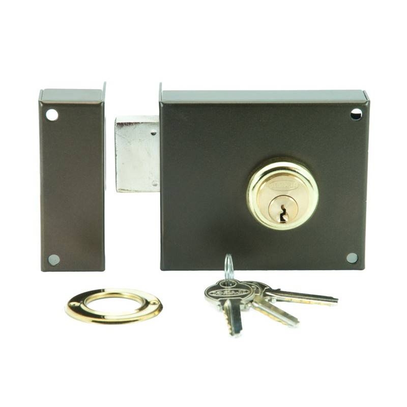 Ref.:124A-12 HEICARACTERÏSTICAS- Cerradura de sobreponer de cilindro con palanca que se acciona con llave por ambos lados. - Medidas del artículo: 120 mm. - Acabado: esmaltado- Nº de llaves: 3.