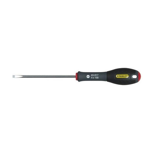 Destornillador de electricista Fatmax de 4x150mm con mango bimateria ergonómico y de gran diámetro, lo que ofrece una gran capacidad de torsión. Cuello delgado para una rápida rotación. El mango está moldeado directamente sobre la varilla de acero. Se puede colgar gracias a su agujero en el mango. Código de color en el mango para identificación del tipo de punta.