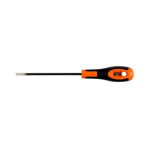 Destornillador de punta recta con mango de goma (0,6x3,5x100mm), para tornillos de cabeza plana y con varilla de electricista. Mango bi-componente para que el trabajo sea rápido y agradable. Las marcas del mango ayudan a identificar rápidamente la punta. Varilla niquelada para evitar la oxidación. ISO 2380/DIN 5264. Mango bi-componente cómodo que proporciona una transmisión eficaz del par de apriete. Identificación fácil gracias a las marcas del mango.