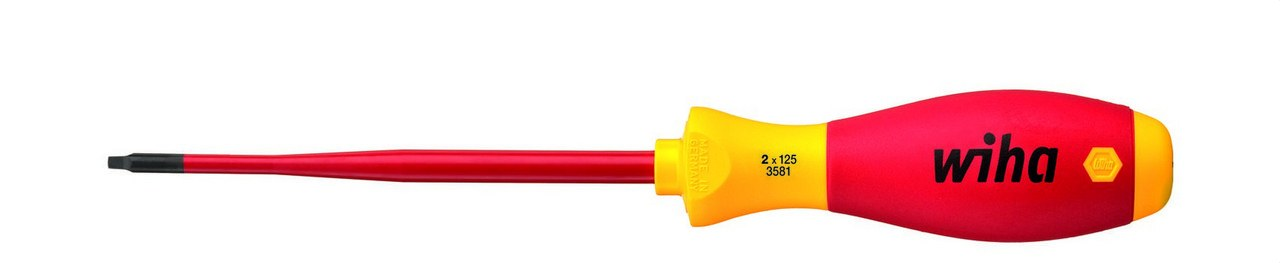 Destornillador SoftFinish 35812125 2x125mm electric slimFix, en acero al cromo-vanadio-molibdeno, valonado, aislado. Es adecuado para el trabajo en el sector de las piezas conductoras de tensión de hasta 1.000 V CA. Las varillas Slim de Wiha garantizan una accesibilidad ilimitada y completamente aislada a los tornillos situados en lugares hondos. El diseño del mango SoftFinish® está patentado para trabajar protegiendo las manos y los músculos. Está recomendado por médicos y terapeutas de la asociación AGR.