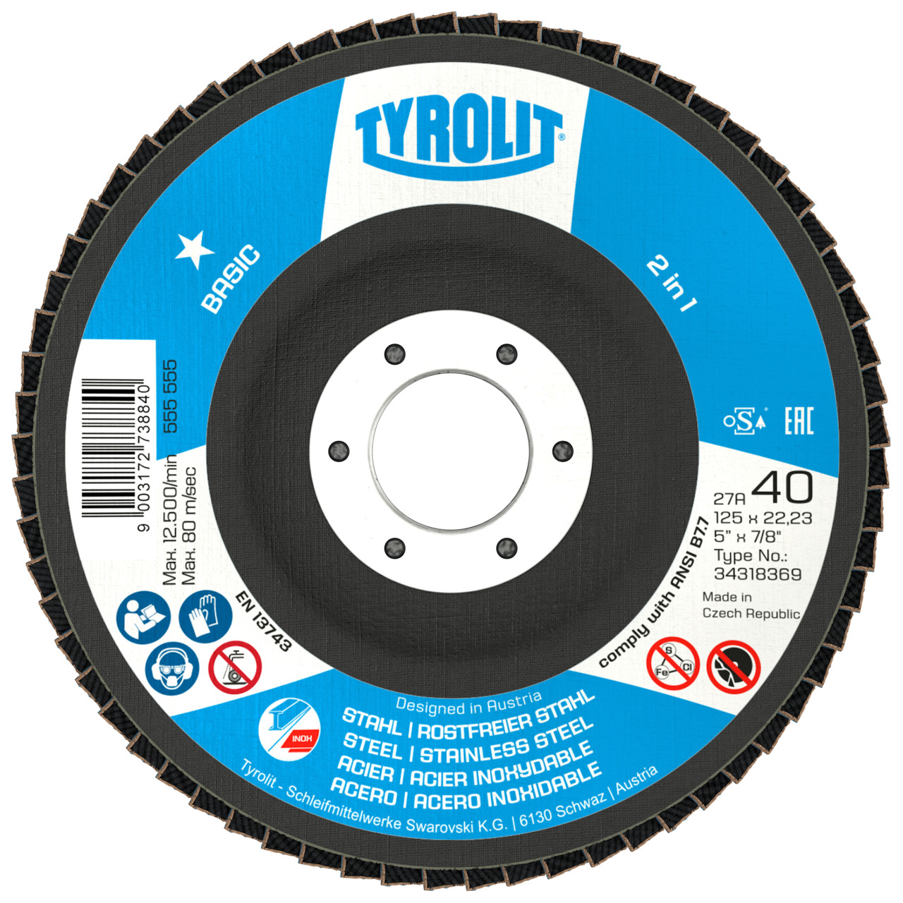Discos de láminas BASIC* 2in1/ para acero y acero inoxidable El disco de láminas BASIC* 2in1 ofrece un buen arranque específico. Mediante una nueva mejora, el disco de láminas BASIC* alcanza también una vida útil inédita y un plus de rendimiento del 30 %. El disco de láminas TYROLIT 2in1 se utiliza tanto en aceros de alta aleación y en acero inoxidable como en aceros no aleados o de baja aleación. Aplicación Aptos para aplicaciones en diferentes calidades de acero y acero inoxidable Recomendación Tamaño del grano 40/60 para un gran arranque Tamaño del grano 80/120 para trabajos finos