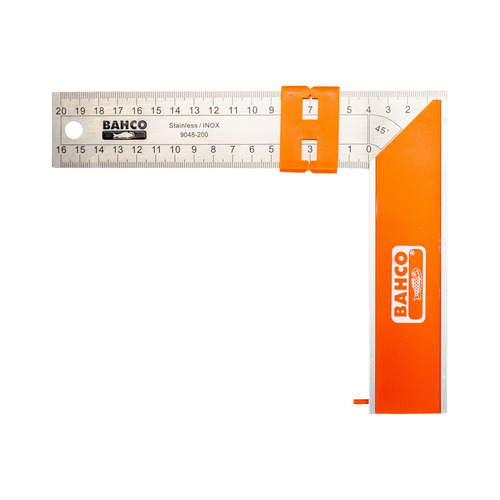 Escuadra de carpintero con hoja de acero inoxidable y marcador deslizante de 400mm, que permite así trabajar con una sola mano fácilmente.