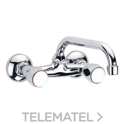 Grifo bimando para fregadero de la serie Guayama de Clever, distancia entre tomas de 15 cm, acabado cromado y diseño sólido para montaje mural.