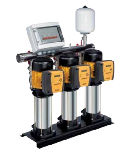 Equipo hidroneumático compacto con tres bombas verticales Multi 55‑6, cada una equipada con variadores de frecuencia Speedrive V2, garantizando una presión continua y adaptada a la demanda. Ideal para aplicaciones domésticas, industriales, agrícolas o de jardinería, como riego por aspersión/goteo, trasvase y presurización.