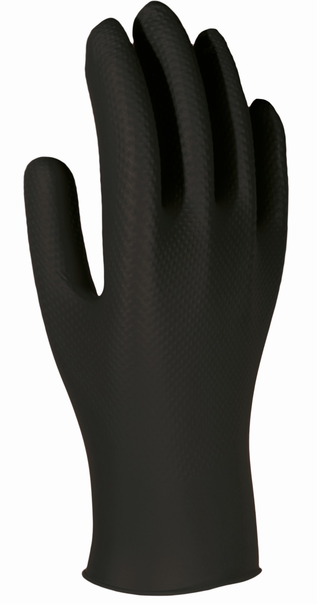 Guantes desechables de nitrilo texturizado libre de polvo Guantes desechables de protección química tipo B. Texturizados en palma y dorso tipo diamante. Gran agarre gracias a su texturizado. Gran resistencia al desgarro superior a un desechable tradicional. Aptos para uso alimentario según Reglamento (UE) 10/2011. No estériles. Libres de siliconas.No contienen proteínas. Ambidextros. Para un solo uso. 240 mm longitud mínima Aplicaciones Hospitales (para exámenes), laboratorios, diagnosis, terapia,limpieza, pintura en spray, jardinería, agricultura, horticultura,talleres, mantenimiento y para el manejo de todo tipo de alimentos.Uso general. MARCAJE MARCAJE QUÍMICO (K) Hidróxido sódico (40%): Nivel 6 (P) Peróxido de hidrógeno (30%): Nivel 4 (T) Formaldehído (37%): Nivel 5