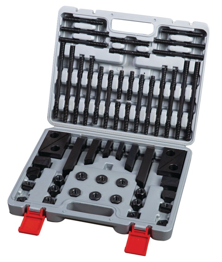 Kit de sujeción para máquinas-herramienta (fresadora, taladro, CNC) con rosca M12. Incluye bridas, espárragos, tuercas en T y apoyos para fijar piezas con seguridad y rapidez sobre la mesa.