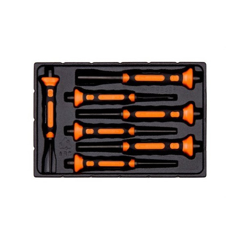 Juego de botadores cilíndricos con mango bi-componente, que incluye 7 piezas 3734BM-2, 3734BM-3, 3734BM-4, 3734BM-5, 3734BM-6, 3734BM-8 y 3734BM-10. Disponible en bandeja de plástico.