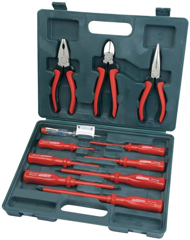 Ref.:M11240 Características: • Modelo: M11240 •7 destornilladores para electricista de alta calidad, con hoja de cromovanadio. •1 probador de voltaje. •3 tenazas con superficie multicapa mate cromada y funda del mago de dos componentes con protección contra resbalamiento. Composición: • Destornilladores planos: -0,5 x 3 x 100 -0,8 x 4 x 100 -1 x 5,5 x 125 -1,2 x 6,5 x 150 • Destornilladores estrella: -PH0 x 60 -PH1 x 80 -PH2 x 100