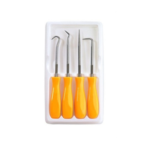 Juego de punzones y ganchos en miniatura de 150mmx80mmx17mm (4 piezas), para trazar, alinear, quitar juntas tóricas, perforar agujeros en cuero o telas. Mangos de plástico con varilla de acero inoxidable. Diseñado para los trabajos más exigentes donde la precisión es de suma importancia