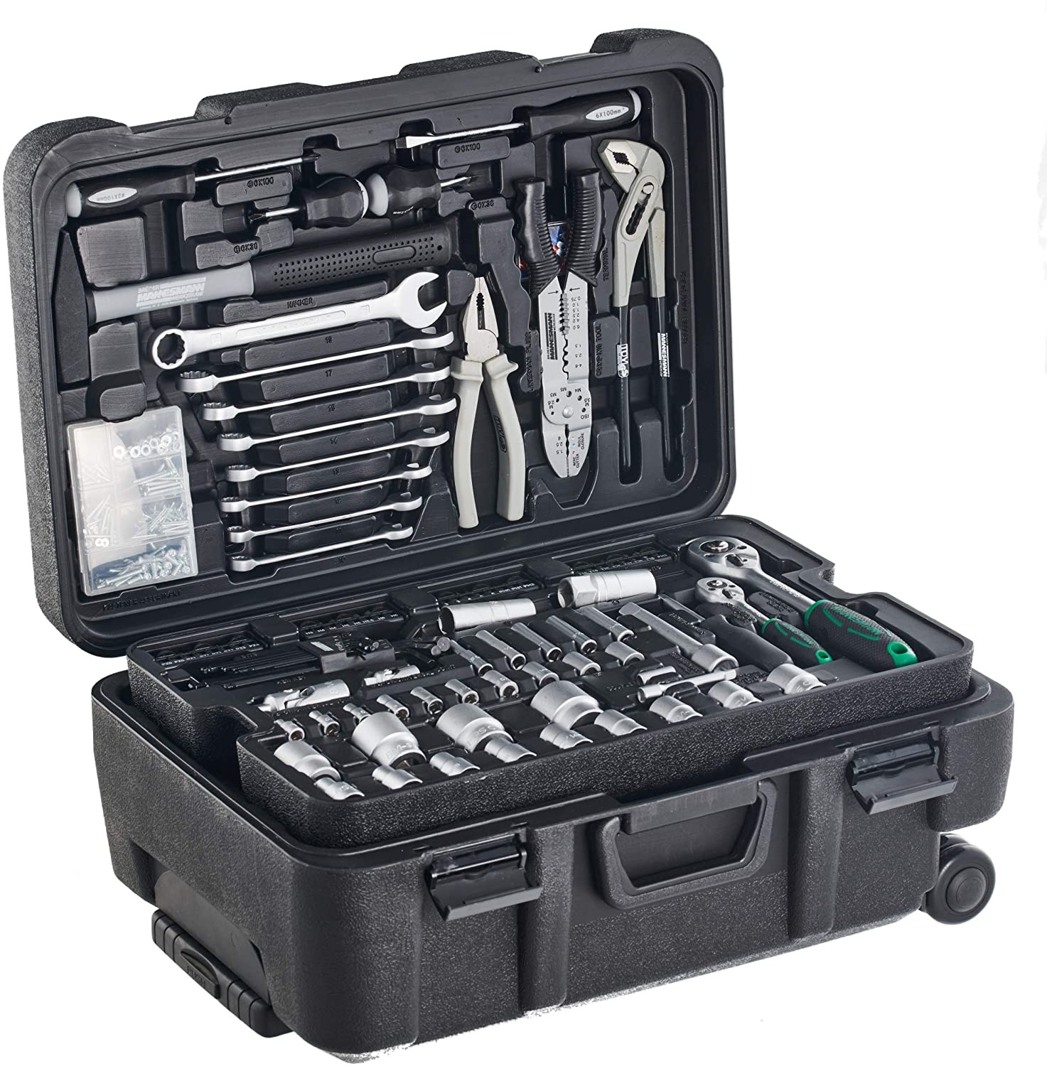 Ref.:M29070Con 122 piezas, este conjunto de herramientas es ideal para todos los trabajos alrededor de la casa, el coche, la bicicleta y el jardín. Incluyendo un martillo, llaves combinadas en diferentes tamaños, alicates, trinquetes y tomas de corriente, el carro de herramientas tiene una rica variedad de destornilladores y bits que completan el contenido. Ademas, el carro de herramientas es móvil y se puede transportar en ruedas de laminación. La caja tiene depósito adicional para otras herramientas.CARACTERISTICAS• Materia piezas: Cromo• Peso del producto: 2 Kg• Dimensiones del producto: 36 x 52 x 25 cm• Número de piezas: 122