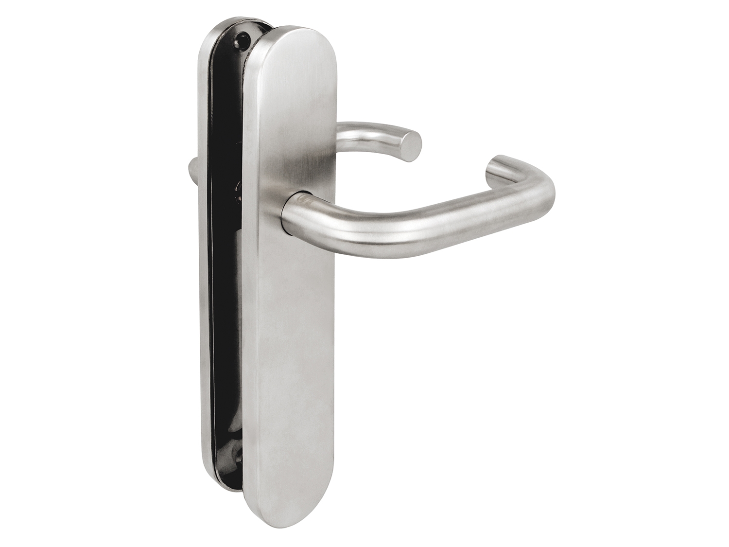 Juego de manillas de acero inoxidable 18/8 con placa. Cuadradillo de 8 mm. Roseta interior de acero inoxidable 18/8.