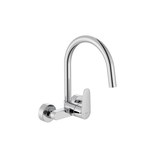 Grifería mural para cocina con caño curvo giratorio.