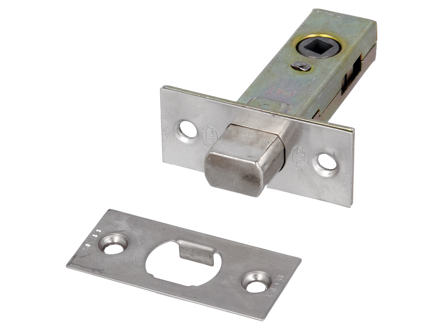 Pasador de embutir con el frente y soporte con cuadradillo de 6 mm. Paramuletillas en puertas de madera de paso o de baño.