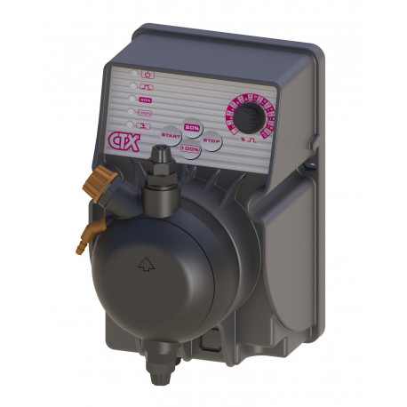 Bomba de membrana de dosificación constante y caudal regulable manualmente con un potenciómetro que determina la frecuencia de las inyecciones. Rango de regulación de 0 a 100% y del 0-20%. Ideal para: Piscina pública. Máxima precisión. Mantenimiento mínimo. Para montaje en la pared o de pie. Funcionamiento simple y seguro. Fabricadas con materiales más resistentes. No requieren lubricación. Cuando aparece aire en la tubería de aspiración deberá de purgar el aire abriendo la válvula de purga, previamente abrá conectado la salida de la válvula de purga a un cubo a un tubo para que no salpique el producto químico. Este equipo debe de ir comandado por un equipo de control y regulación con salida analógica 4-20 mA de regulación.