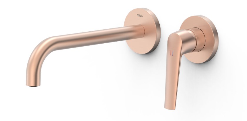 Parte superficial decorativa de lujo para griferías empotradas de lavabo, perteneciente a la colección Fuji de TRES. Acabado en oro rosa mate 24 K, con caño sobresaliente de 237 mm, placa embellecedora y mando metálico incluido.