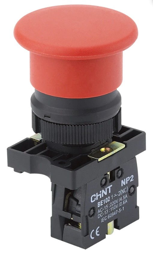 Pulsador tipo seta de 40 mm NP2-EC42 de CHINT, fabricado en plástico y diseñado para accionamiento manual en instalaciones eléctricas.