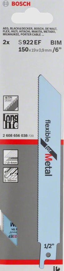 Pack de 2 hojas de sierra sable Bosch S 922 EF, diseñadas para cortes precisos y limpios en metal. Fabricadas en bimetal (BIM), combinan alta durabilidad y flexibilidad, ideales para trabajos exigentes en talleres o montaje.