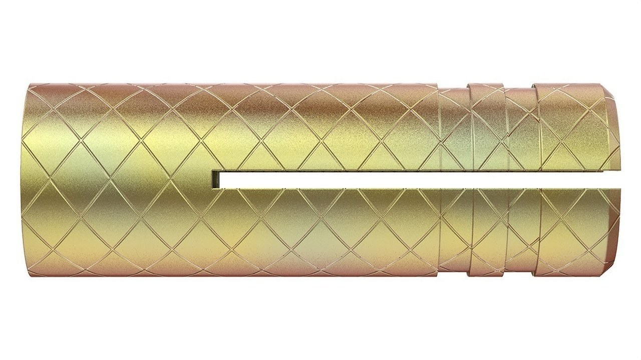 Taco expansionable de latón con rosca cónica interna para cargas ligeras Para cargas ligeras Expansionado por roscado Uso con tornillos o varillas metálicas Debe ser colocado con varilla de acero roscada o tornillo Fácil aplicación Aplicaciones Para montajes colgantes de varilla roscada