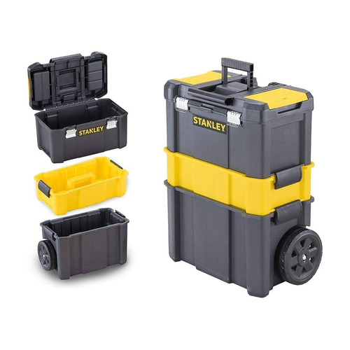 Taller móvil 3 en 1 Essential con cierres metálicos. Caja de herramientas superior de 45cm / 18 con Organizadores en la tapa para pequeñas piezas y cierres metálicos geométricos con bloqueo para mayor seguridad. Módulo central extraíble para herramientas manuales. Compartimento de gran capacidad. Ruedas 18cm para una mejor maniobrabilidad. Asa plegable para mayor comodidad.