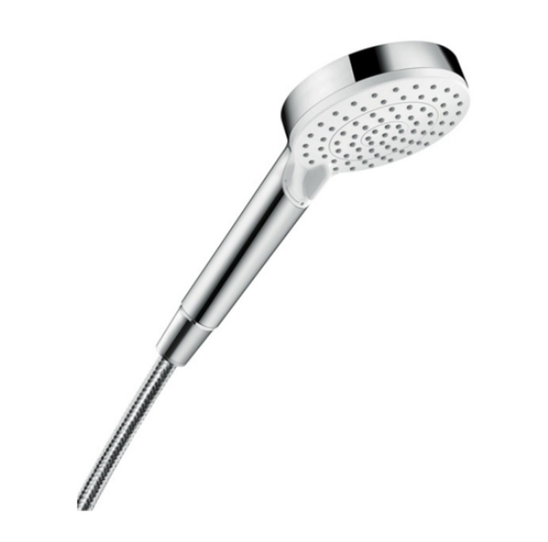 El teleducha Crometta Vario blanco y cromo posee la tecnología QuickClean que elimina fácilmente los depósitos de cal. La invención, QuickClean, elimina en un momento las impurezas y depósitos de cal de las duchas y griferías. las protuberancias flexibles de silicona se encargan de la limpieza. Atención a las copias: sólo este logotipo de QuickClean garantiza la calidad auténtica de Hansgrohe.