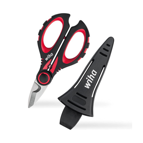La tijera de electricista es el compañero ideal para el electricista para el uso móvil. Su opción de uso universal confirma a la tijera con las cuatro funciones: Cortar a medida, desaislar, pelar y crimpar. Gracias a la entalladura en la hoja de gran tamaño y al microdentado fino, los cables se pueden cortar a medida sin esfuerzos y evitando que el cable se deslice de la tijera. Además, también se pueden desaislar y pelar los cables. La entalladura detrás la articulación de la tijera sirve para el crimpado sencillo de extremos de cables entre 1 - 5 mm². Para la utilización portátil, la tijera de electricista se puede fijar de manera cómoda en el cinturón gracias a la práctica funda protectora con clip de sujeción. Para cortar a medida, desaislar, pelar y crimpar cables. El volumen de entrega incluye una funda protectora con clip de sujeción. La entalladura en la hoja de gran tamaño y el filo de corte microdentado evitan que el cable se deslice de la tijera. Funda protectora con clip de sujeción para un transporte seguro. La combinación de la hoja estable y el mango ergonómico con ojales de sujeción extra grandes permite realizar un corte limpio en cables de hasta 50 mm². Tijera de electricista con las funciones de cortar a medida, desaislar, pelar y crimpar en una herramienta.