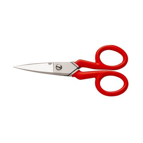 Tijeras de electricista con pequeña ranura y hoja dentada de 45mm. Pequeña ranura en la hoja para pelar cables. Longitud de corte de 45mm. Tijeras de electricista con dedales recubiertos de plástico.